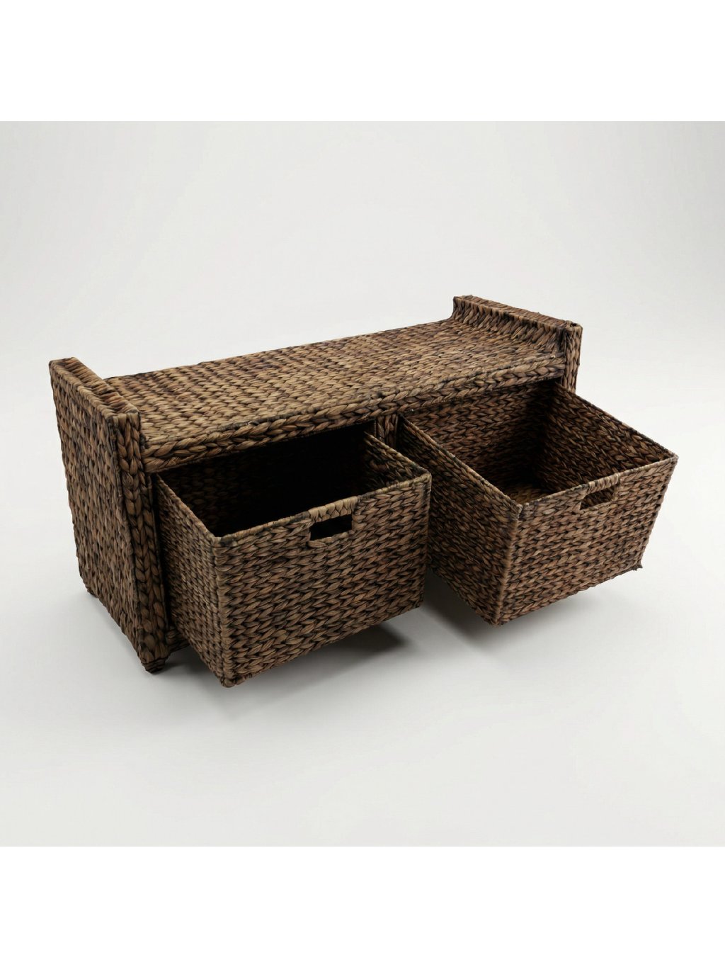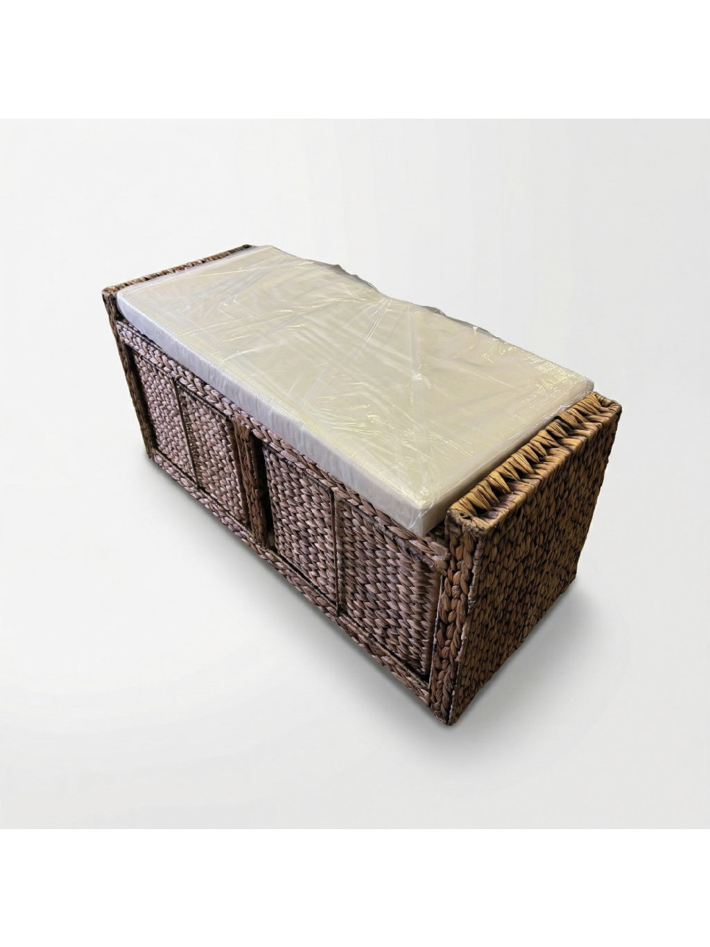 Pohodlná lavice široká 100 cm s úložným prostorem! Pevný dřevěný rám opletený přírodním vodním hyacintem v hnědém odstínu. Měkký sedák s pratelným bavlněným potahem a dva praktické šuplíky. Stabilní, robustní a snadno udržovatelná. Ideální do předsíně, ložnice či obýváku.